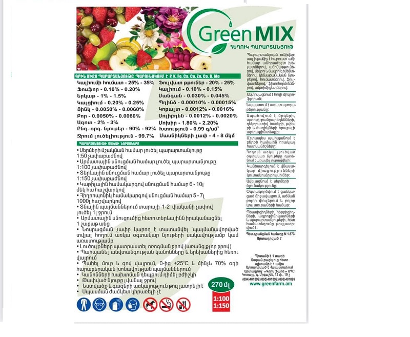 ԳՐԻՆ ՄԻՔՍ ՕՐԳԱՆՈ ՄԻՆԵՐԱԼ ՖՈՒԼՎՈ ՀՈՒՄԱՏԱՅԻՆ ՈՒՆԻՎԵՐՍԱԼ ՀԱՅԿԱԿԱՆ ՊԱՐԱՐՏԱՆՅՈՒԹ 💚 Ակտիվացնում է ծառերի,թփերի, ————————————————————————————————————————————————————————————————————— բույսերի,ծաղիկների և սածիլների որակյալ աճման ընթացքը: 💚 Նպաստում է առատ պտղաբերությանն ու արմատային համակարգի բարելավմանը: ————————————————————————————————————————————————————————————————————— 💚 Բարձրացնում է մշակաբույսի դիմադրողականությունը: ————————————————————————————————————————————————————————————————————— 💚 Հողում առկա չլուծված նյութերը դարձնում է յուրացվելի: ————————————————————————————————————————————————————————————————————— 💚 Կանխարգելում է վնասակար նյութերի կուտակումը բույսի մեջ: ————————————————————————————————————————————————————————————————————— 💚 Բնամթերքին տալիս է հրաշալի համ և տեսք,ակտիվացնում է հողի միկրոֆլորան: ————————————————————————————————————————————————————————————————————— 💚 Բուժանյութերի հետ համատեղելի է: ————————————————————————————————————————————————————————————————————— 💚 Մշակաբույսի սահմանափակում չկա ————————————————————————————————————————————————————————————————————— 💚 Պարունակում է՝ մակրո և միկրո տարեր,ֆուլվատ,հումատ,ամինաթթու,ֆիտոհորմոններ,վիտամիններ,pH 6-6.5 ————————————————————————————————————————————————————————————————————— 💚 Պարկը 25-կգ է, գինը՝ 6500 դրամ ————————————————————————————————————————————————————————————————————— 💚 Առաքումը՝ սկսած 3 պարկից ————————————————————————————————————————————————————————————————————— 🇦🇲 ԱՐՏԱԴՐՎԱԾ Է ՀԱՅԱՍՏԱՆՈՒՄ 🇦🇲 ԱՐՏԱԴՐՈՂ՝ ԳՐԻՆ ՖԱՐՄ ՍՊԸ ԿՈՏԱՅՔԻ ՄԱՐԶ գ. ՄՐԳԱՇԵՆ 12 փող 19 շ ————————————————————————————————————————————————————————————————————— 🇦🇲 ԱՐՏԱԴՐՈՂ՝ ԳՐԻՆ ՖԱՐՄ ՍՊԸ 🇦🇲 📞094401899 📞095401899 📞096401899
